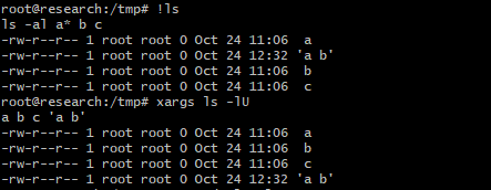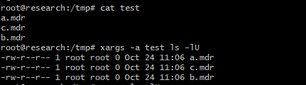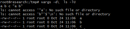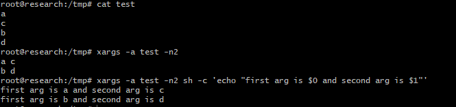 즉, 위 옵션 중 일부가 동시에 지정된 경우 xargs는 일반적으로 마지막으로 지정된 옵션을 사용하고 충돌이 있는 앞선 옵션은 기본값으로 설정한다. 추가적으로 xargs는 stderr에 경고 진단을 표시한다.